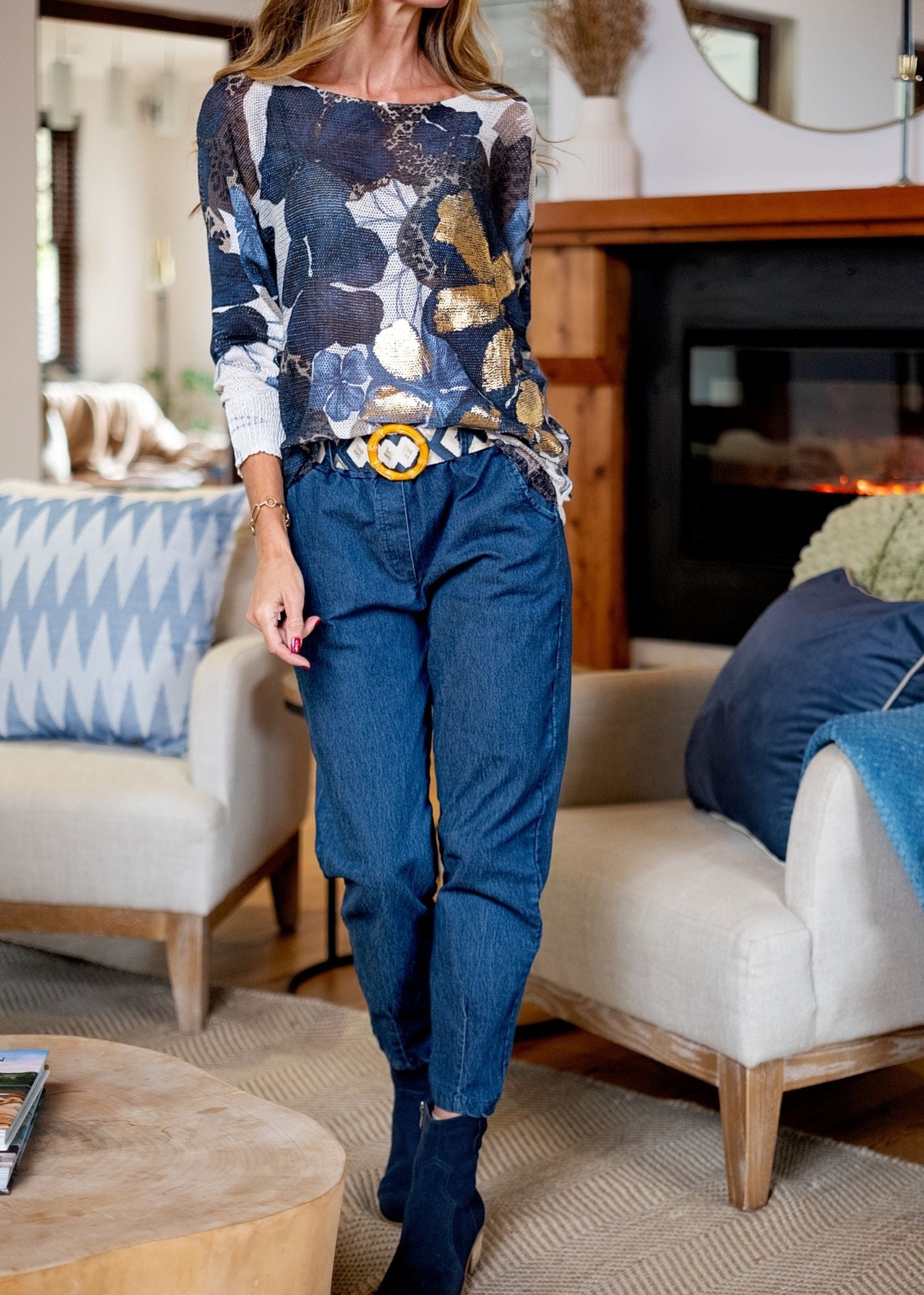 Striking, confident, and impossible to ignore—the Élan Knit Top is designed for women who don’t do ordinary. Featuring a bold floral artwork with luminous gold accents, this piece brings together wild elegance and modern edge.