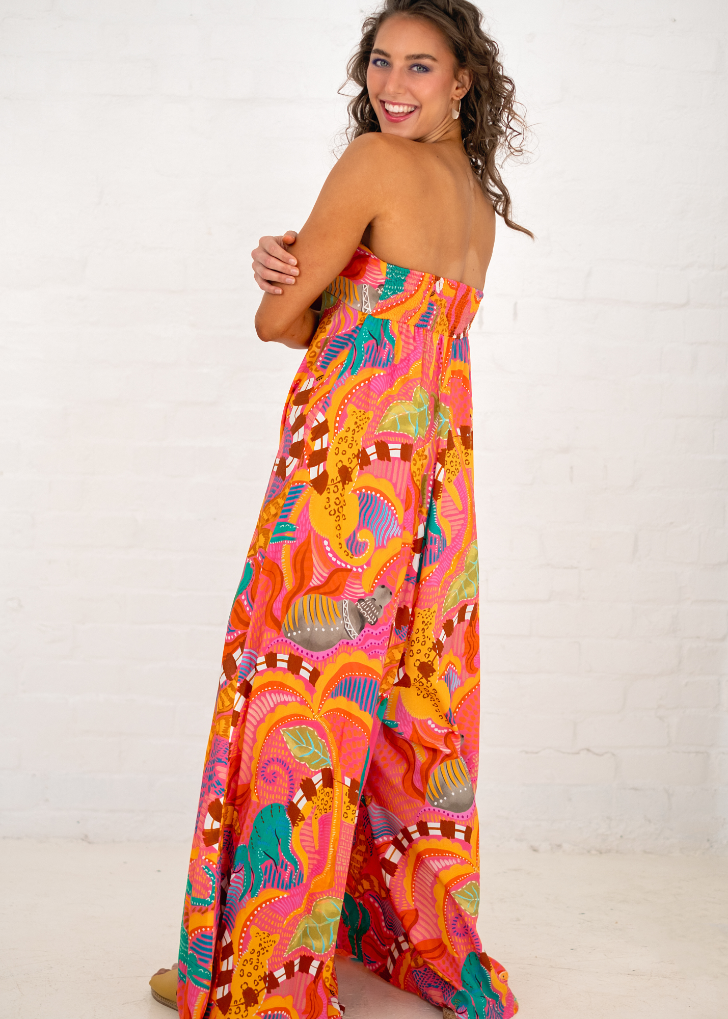The bold Safari Sunset print bursts with vivid oranges, pinks, greens, and splashes of turquoise — inspired by tropical heat, exotic adventures, and a fearless love of colour. With subtle smocking across the back for a flexible fit, this piece combines sophistication and fun in perfect balance.
