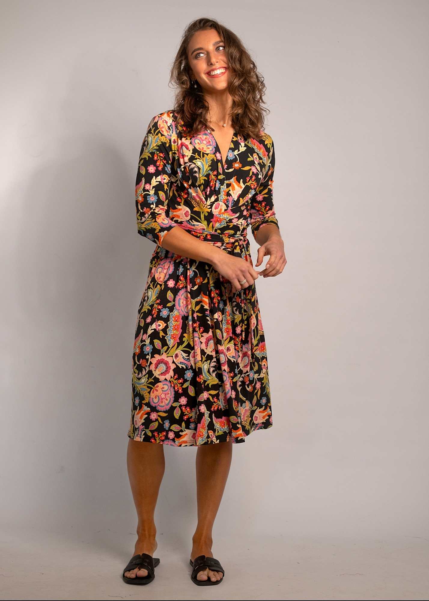 Inge Wrap dress - knee length in Black and Coral Flowers