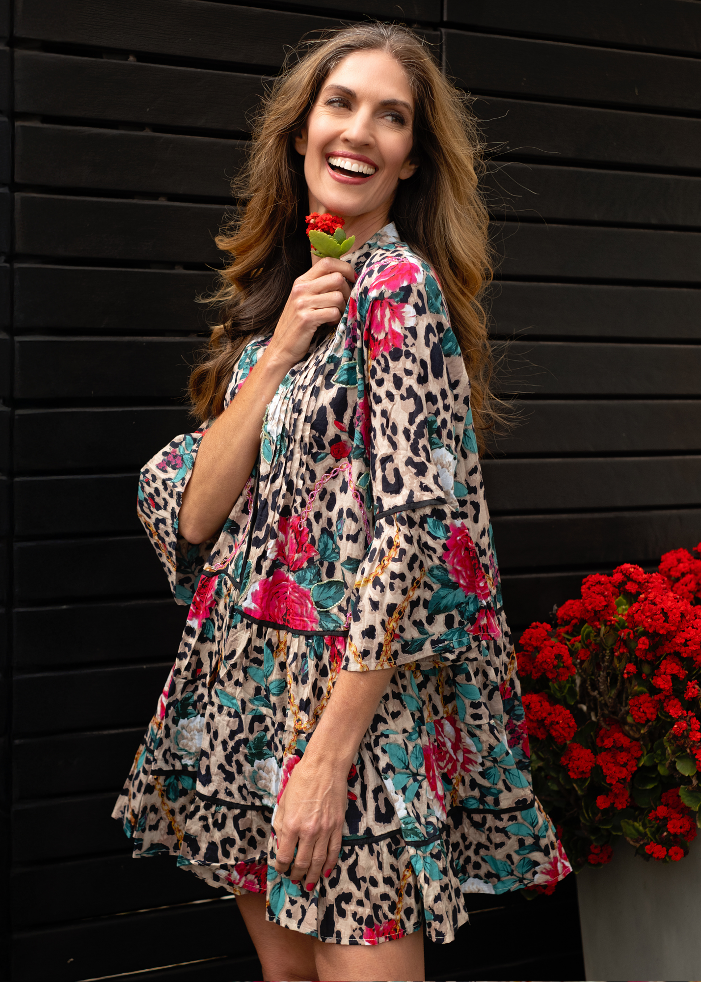 The La Rosa Leopard Tiered Mini Dress captures the essence of Italian flair with a fun twist. Featuring a bold leopard print accented by vivid roses, this dress boasts a tiered ruffle silhouette and a comfortable, relaxed fit. Designed to attract attention, it has a button-down front and flowing bell sleeves that add a dramatic flair to your look.