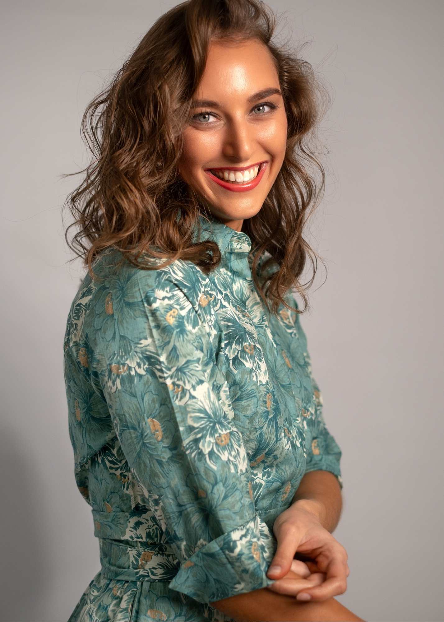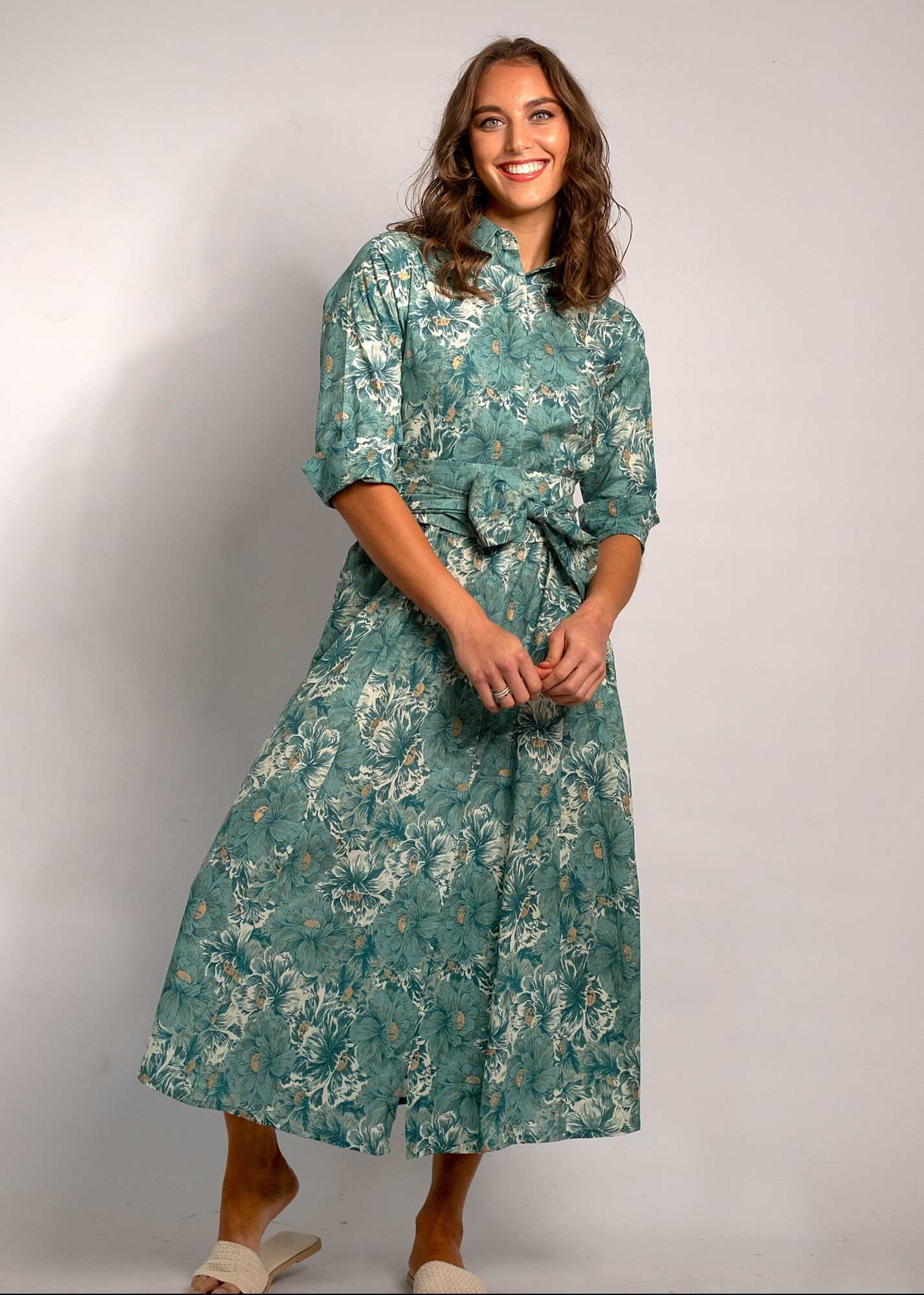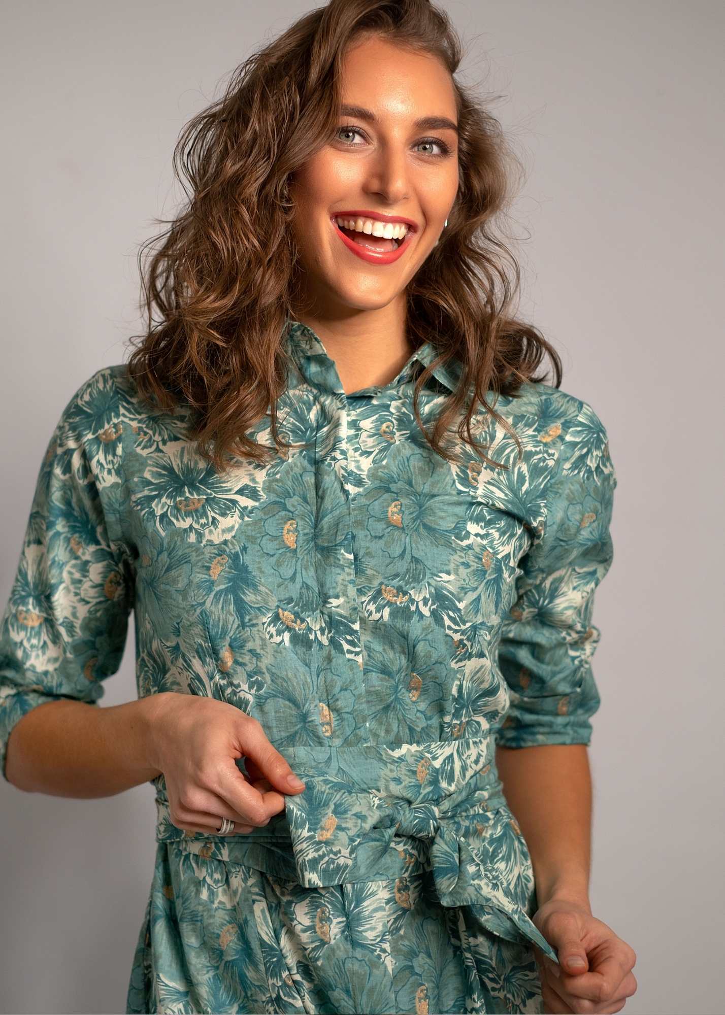 The Marigold Dress combines elegance and comfort, making it a flattering choice for all body types. Made locally in Cape Town from soft, breathable 100% cotton, it boasts a classic shirt collar, button-front bodice, and a flowing skirt for movement. A self-tie belt defines the waist, creating a sleek silhouette. Proudly South African, this timeless dress is available in sizes XS to XXL.  Model height: 1.72m, wearing a Medium.