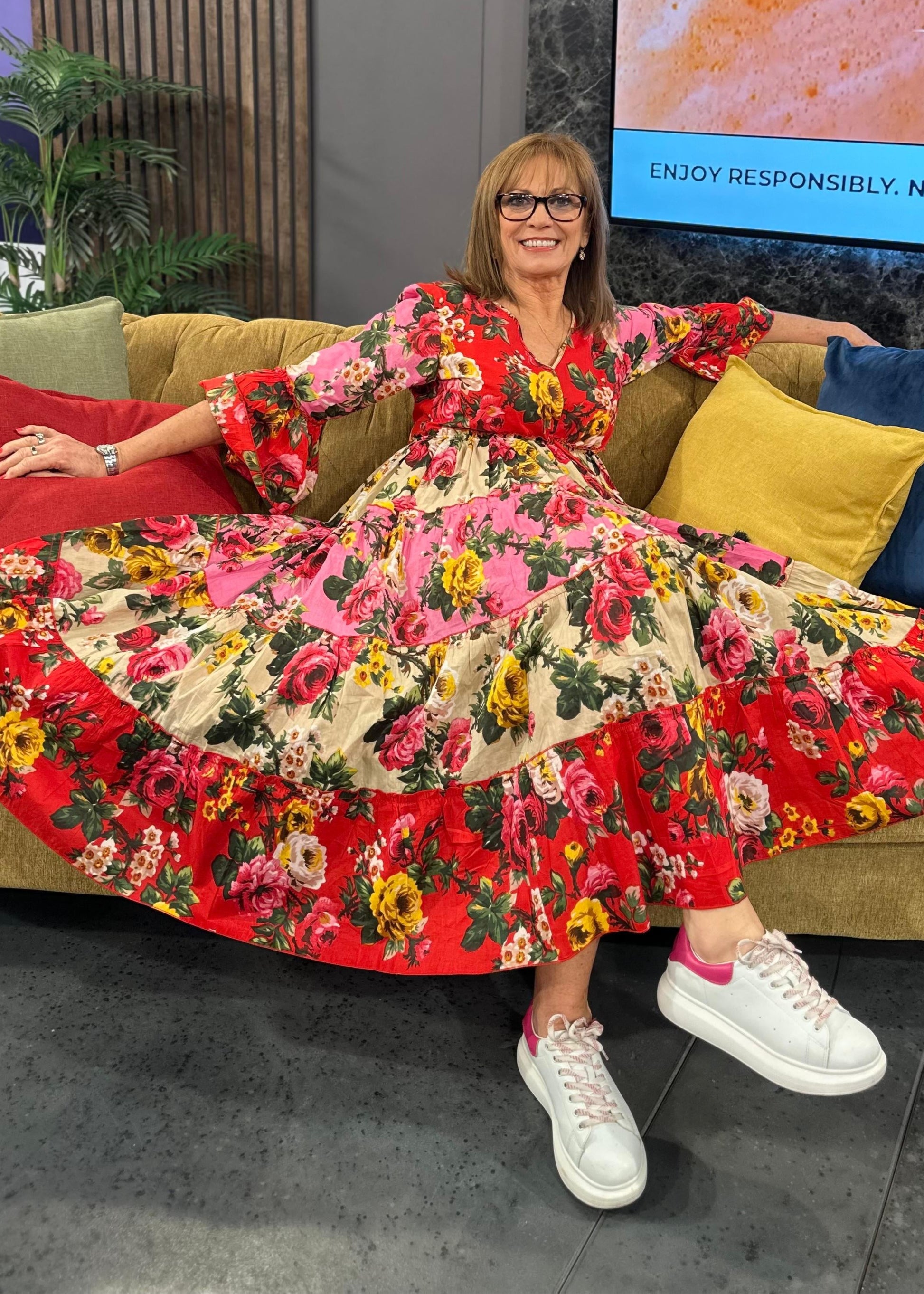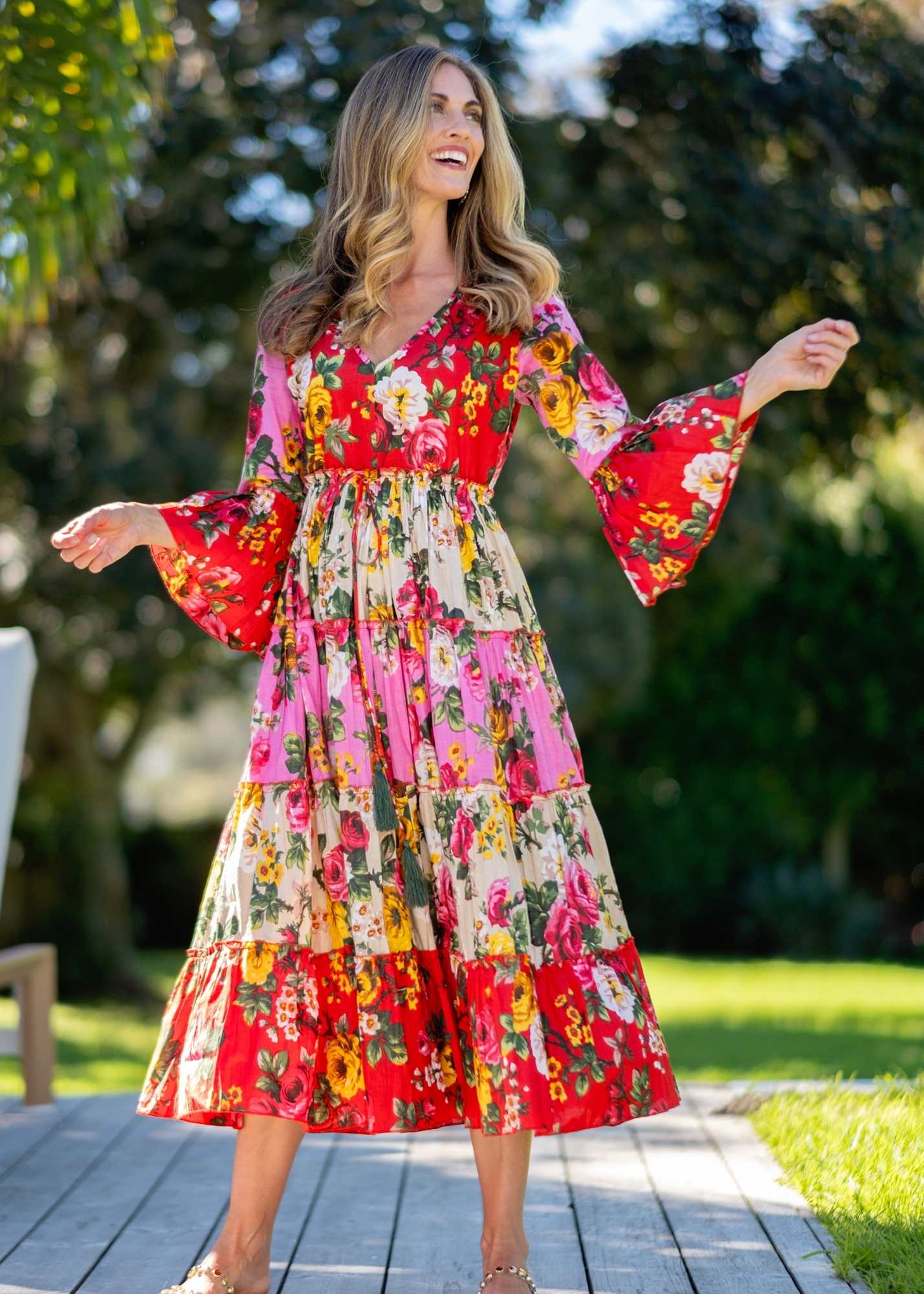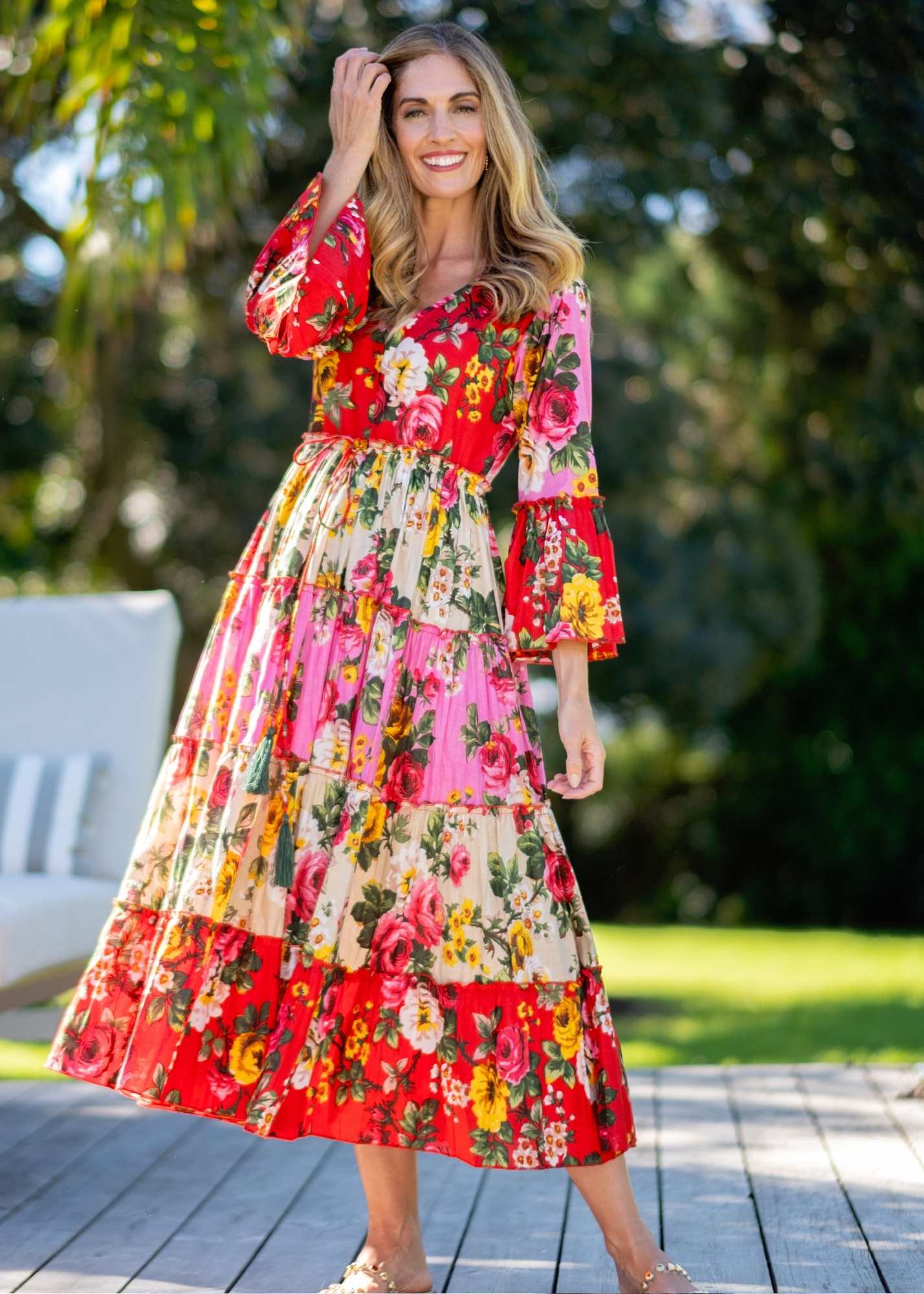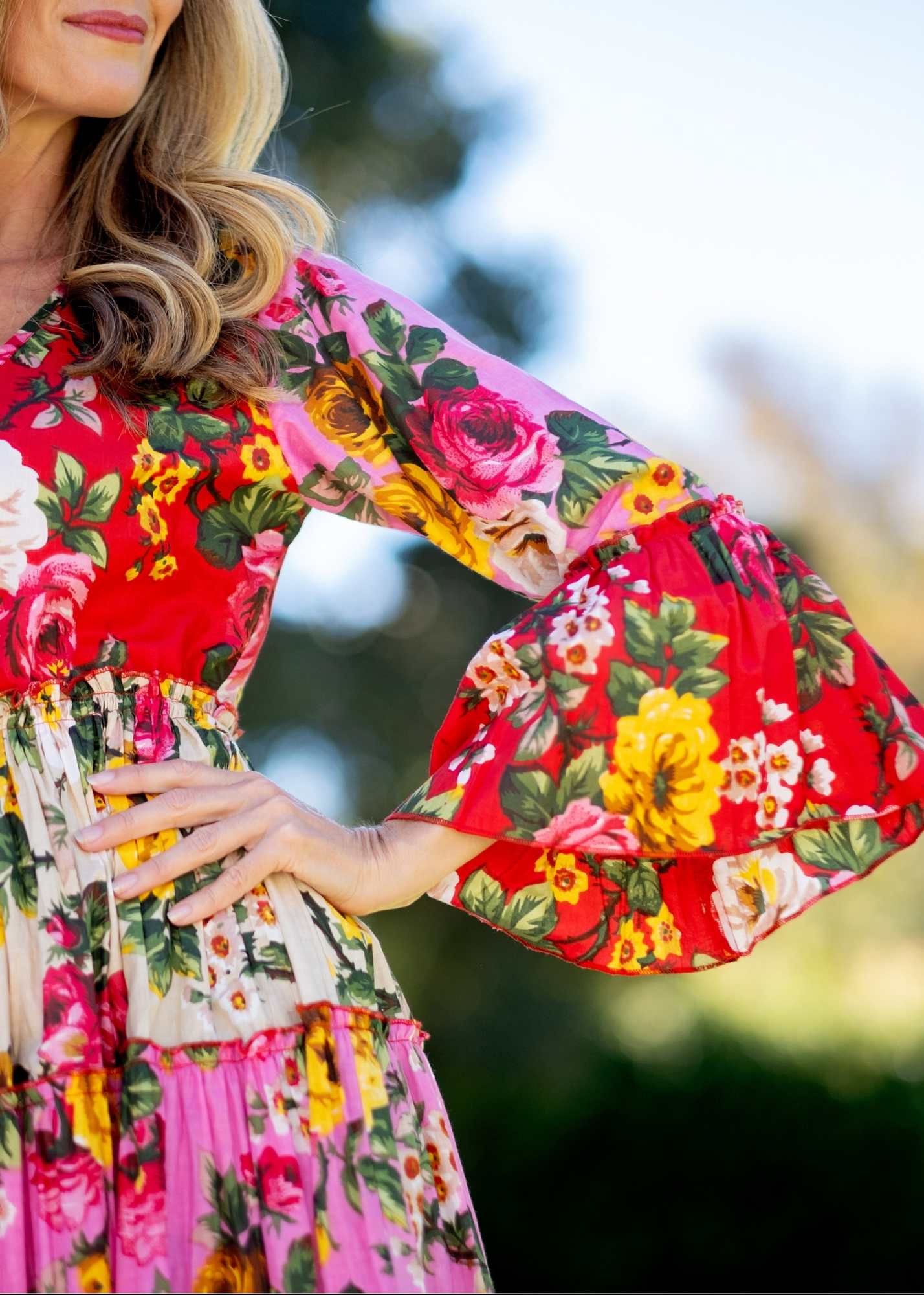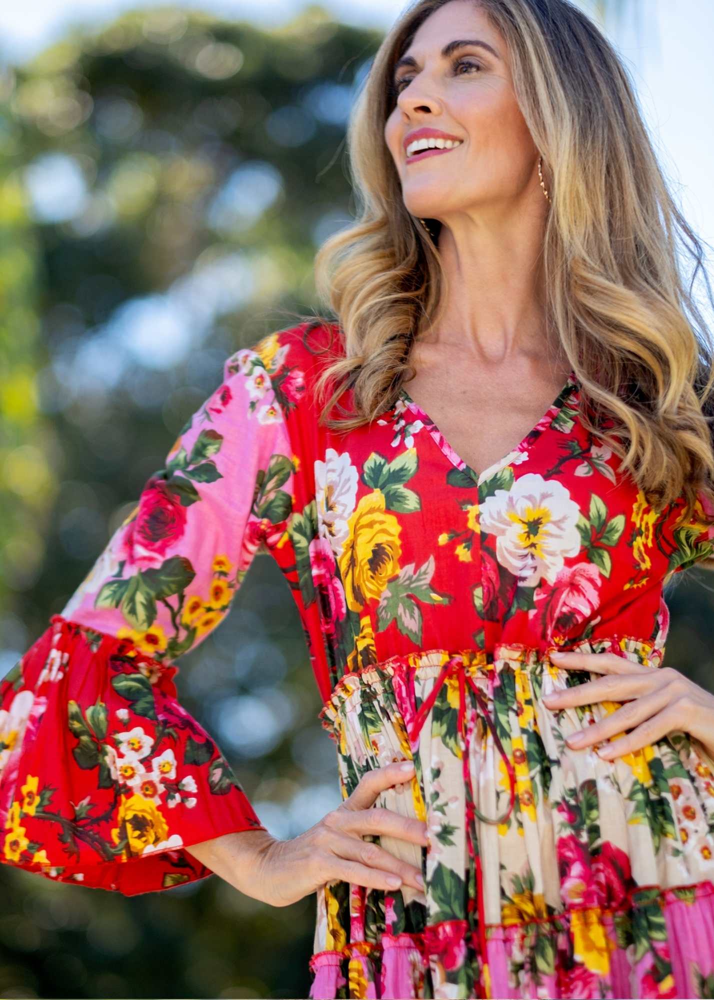 Escape to a sun-drenched paradise with our Amarena Dress in vibrant Riviera Red. Part of our exclusive Solara Collection, this dress captures the joy of long, carefree days and balmy evenings. The rich, ruby-red background is a canvas for a stunning, multi-hued floral pattern of delicate coral, soft pink, and white blooms, accented by lush green leaves.