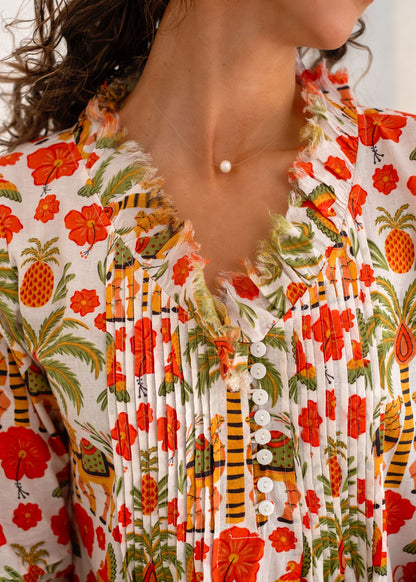 Made from 100% cotton, this easy-wearing piece has a flattering V-neck with delicate pintuck and button detail, finished with frilled accents around the neckline and sleeves. The slim fit through the bust flows into a relaxed, Knee-length silhouette with ¾ sleeves