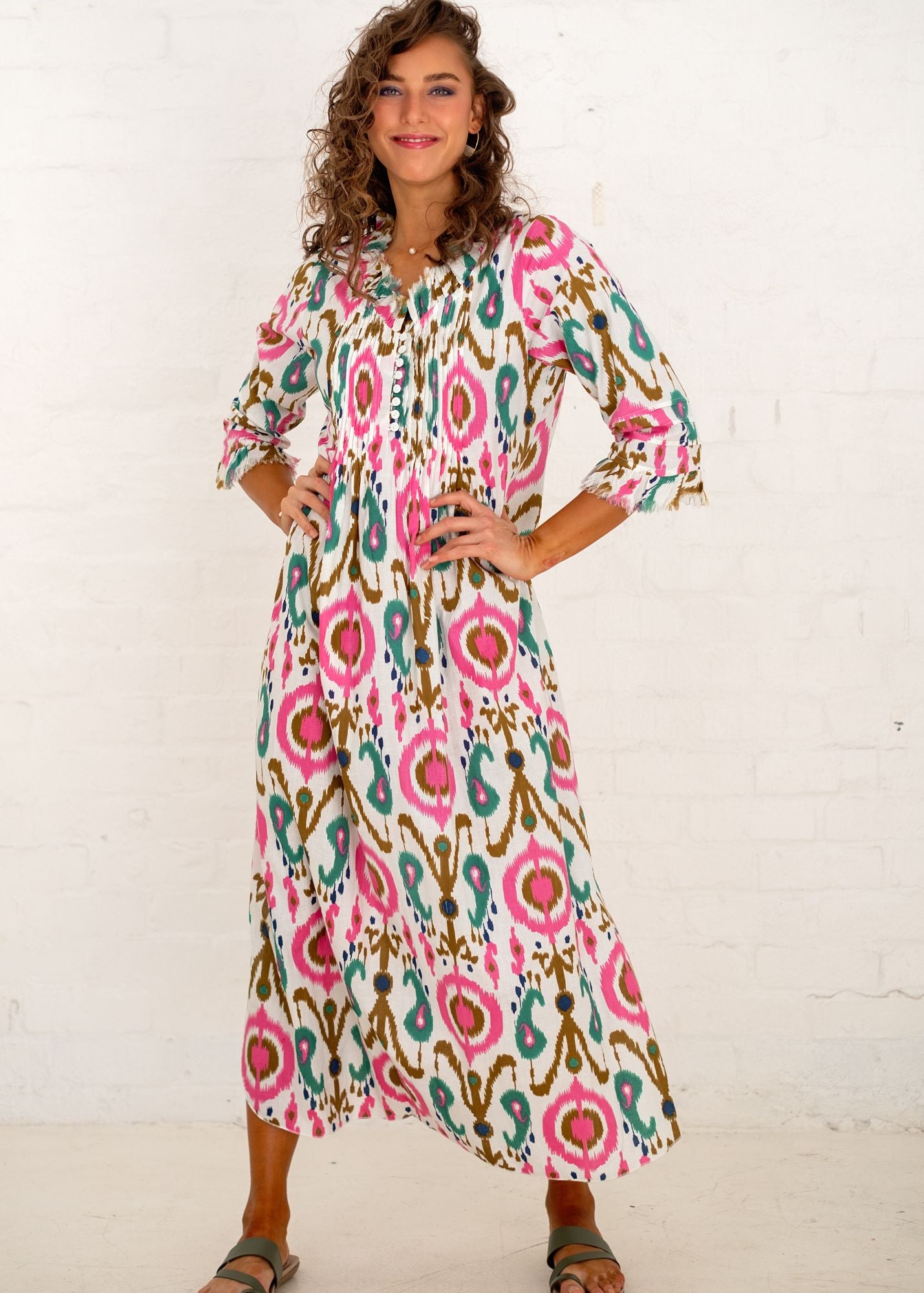 Sarah Dress with Frill in White and Pink Ikat Calf Length