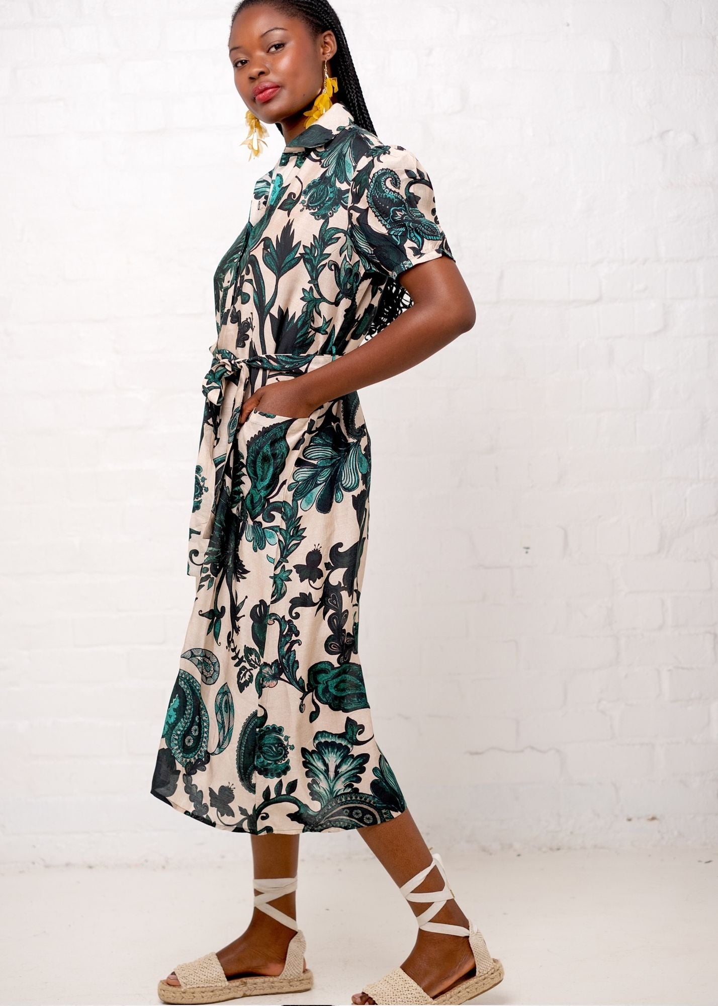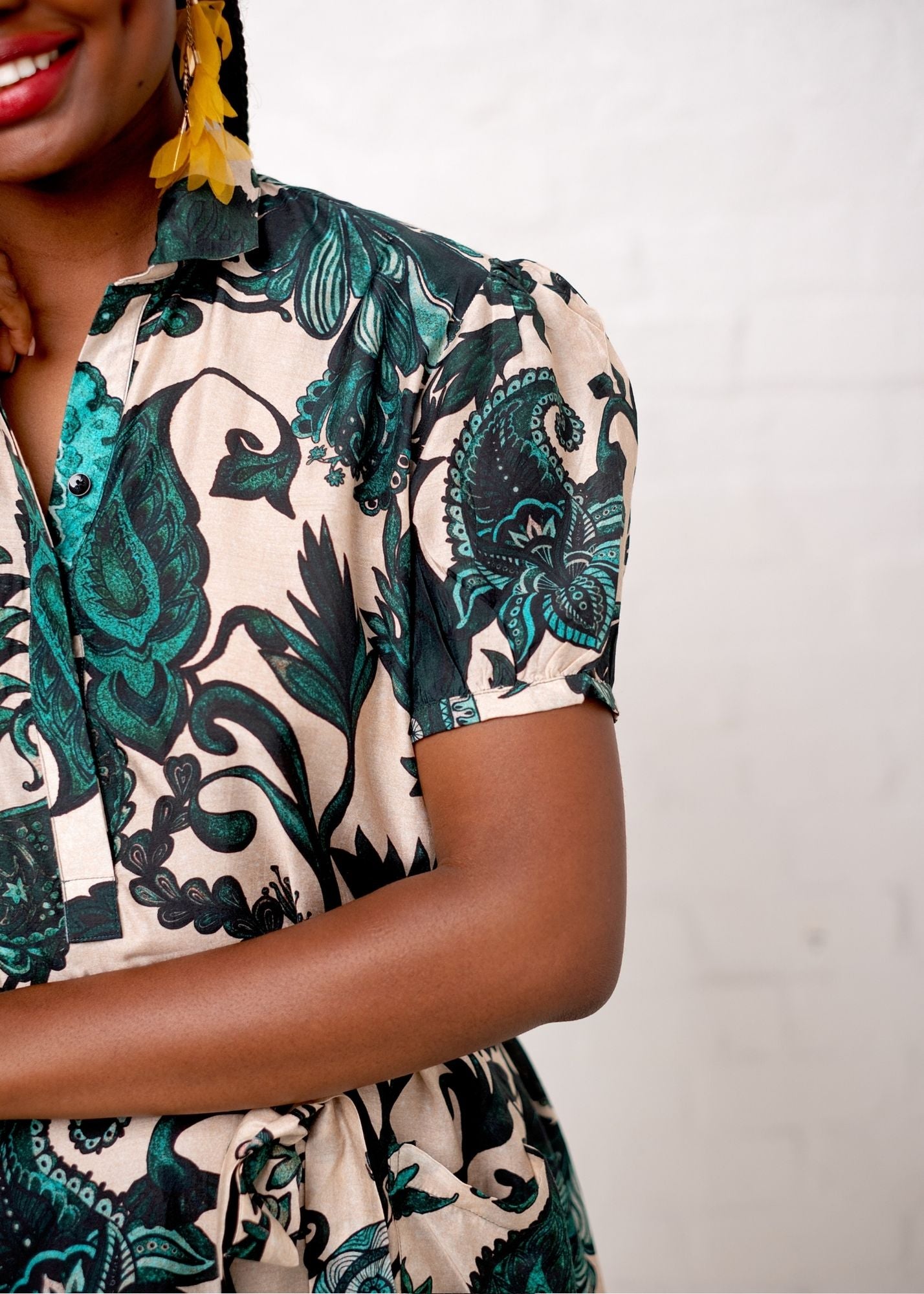 Get ready to turn heads in the Vivienna Dress! Designed in South Africa and made in India, this midi shirt dress boasts a gorgeous  print.